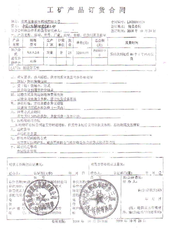 2008年10月28日中國人民解放軍總參三部物資處3名解放軍干部來我公司實地考察。考察比較后對我公司的規(guī)模和產(chǎn)品給予了極大的肯定,并就一直聯(lián)系的要購買的25臺鋁合金升降機簽訂了訂貨合同?,F(xiàn)我公司已按照約定如期交貨,總參三部驗收后非常滿意,并已全部付款到位。