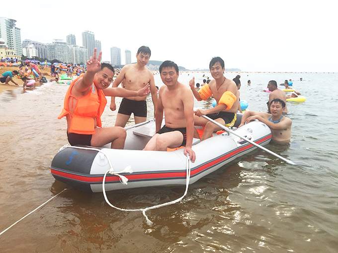 吃過午飯,我們一行人來到了威海國際海水浴場,不愧是國際海水浴場,灘緩沙細(xì),水質(zhì)清澈,松林環(huán)繞。花草、石雕點綴于岸邊,令人新曠神怡。看著那迷人的海灘和不斷奔涌而上的浪潮,遠(yuǎn)處氣勢磅礴的海面卷起的層層浪花,走在沙灘上,感受著浪花在腳上一次次的沖刷。換上泳衣,租個皮劃艇,同事們迫不及待的開始下水了。